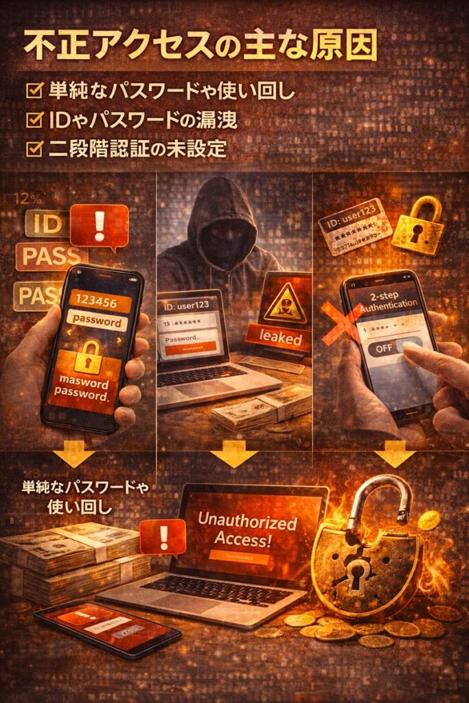不正アクセスの主な原因は以下の3つです。