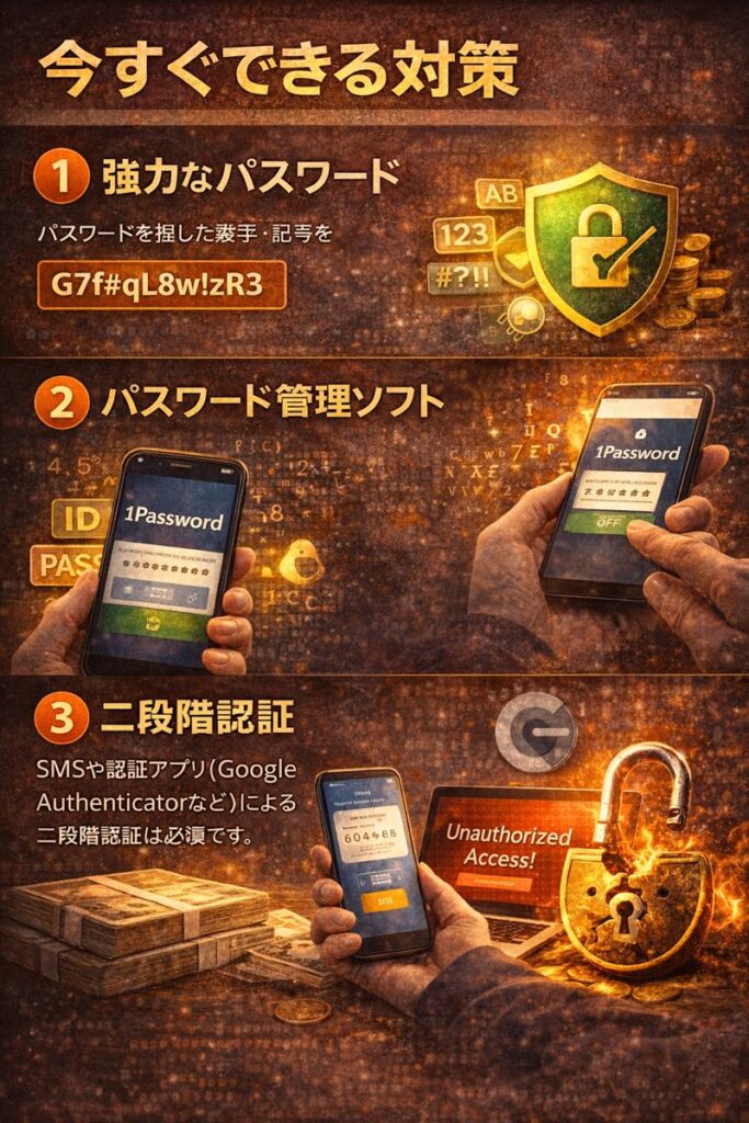 SMSや認証アプリ(Google Authenticatorなど)による二段階認証は必須。